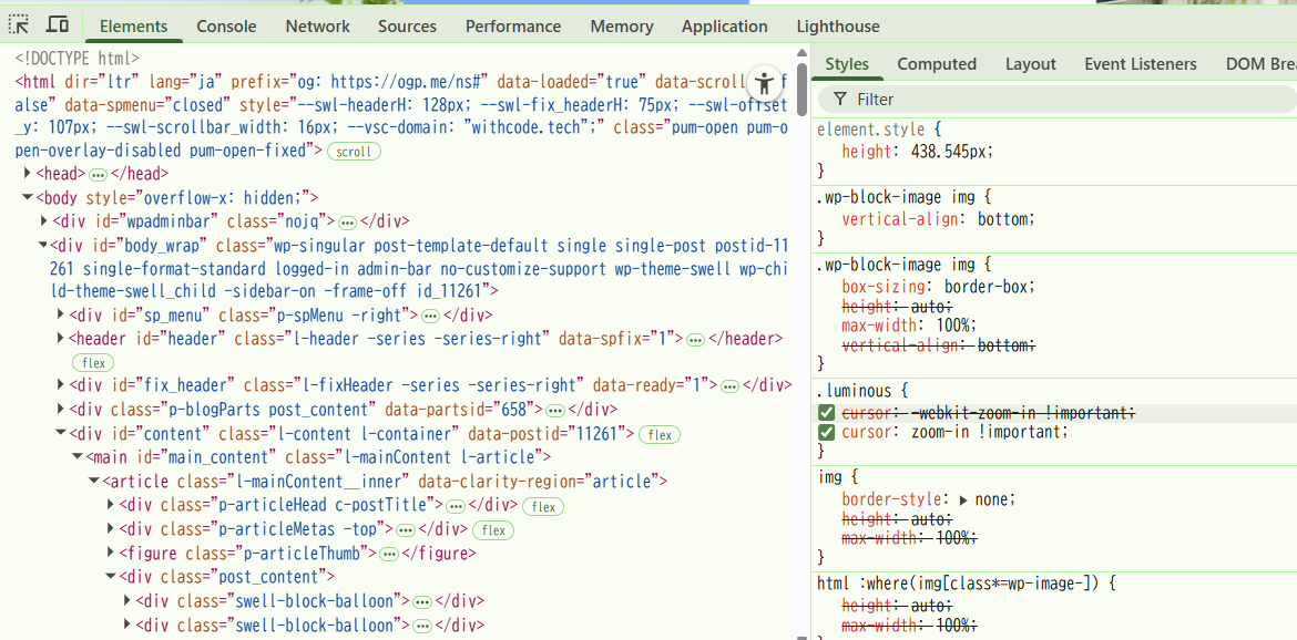 選択した要素が自動でハイライトされるため、どのHTML構造にどのスタイルが当たっているかをすぐ確認できます。