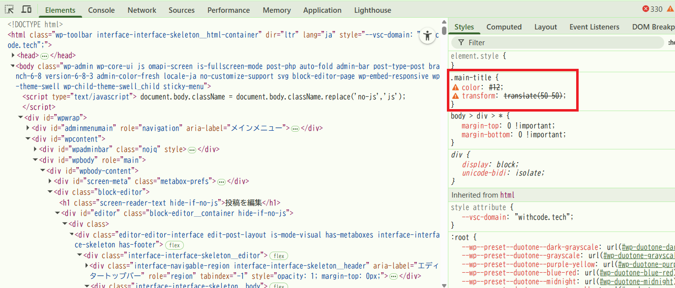 これらのエラーはDevToolsの「Styles」パネルで確認でき、無効なプロパティの横には警告アイコンや打ち消し線が表示されます。