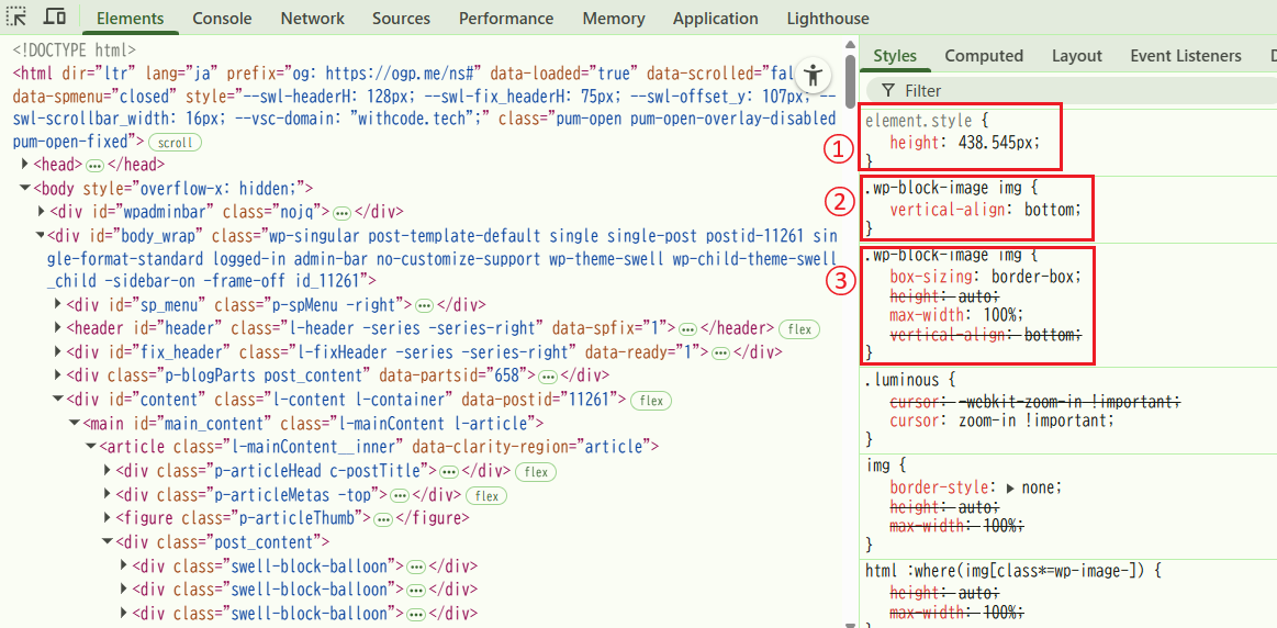 }DevToolsの「Styles」パネルでは、適用順位を以下の①〜③のように上から順に確認することが可能です。