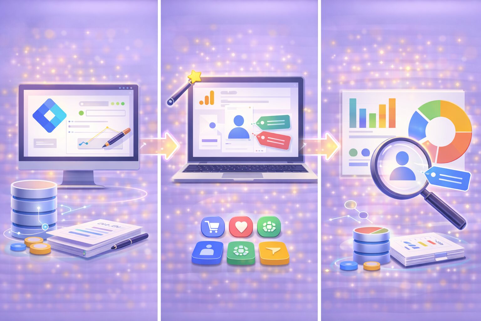 カスタムディメンションの実装は、「GTMで計測設定 → GA4で登録 → レポートで活用」の3段階で進めるぞ!