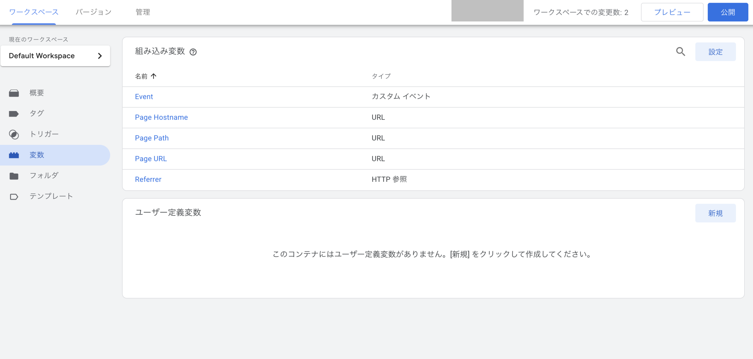 GTMで「変数」セクションを開き、「新規」をクリックします。