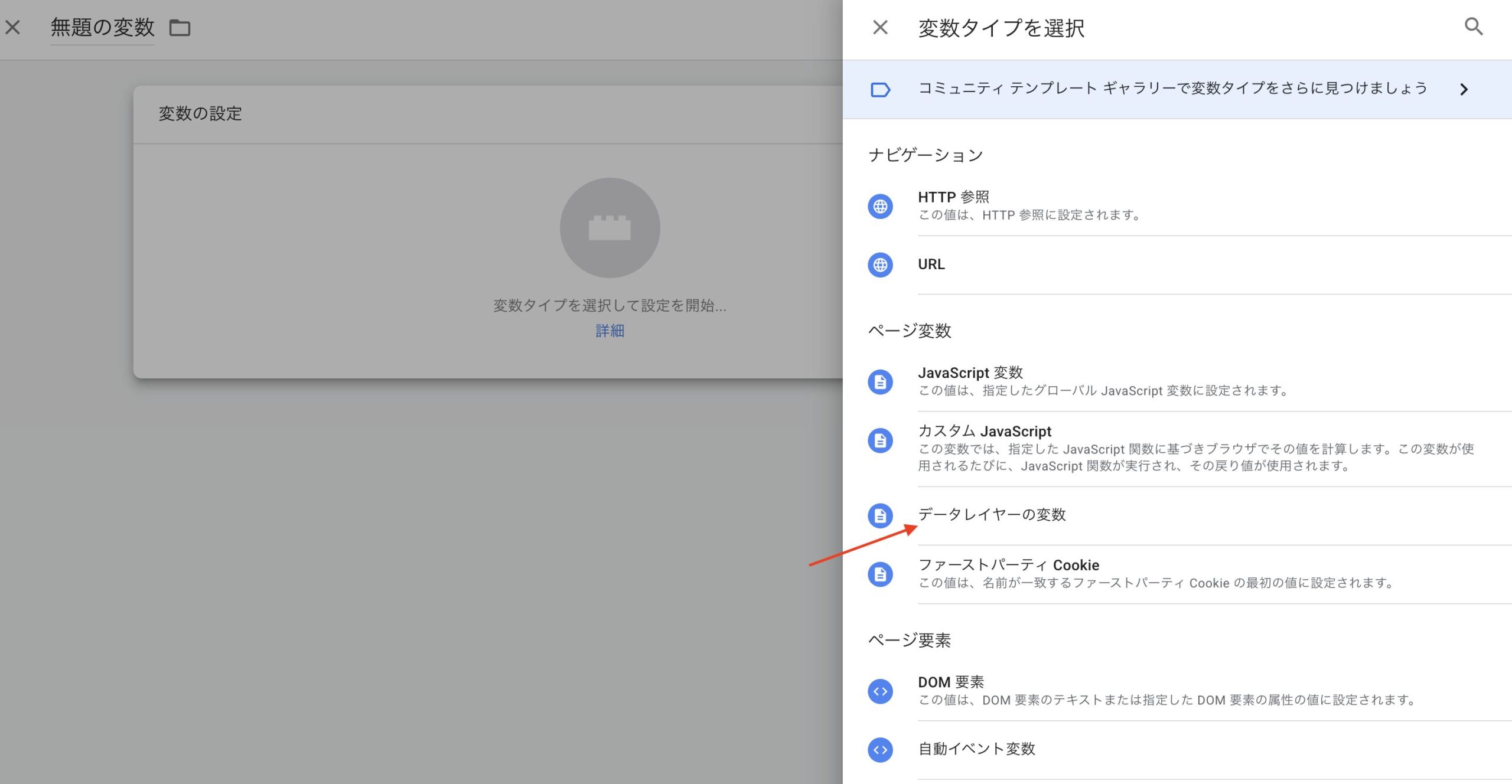 変数タイプ: 「データレイヤーの変数」を選択