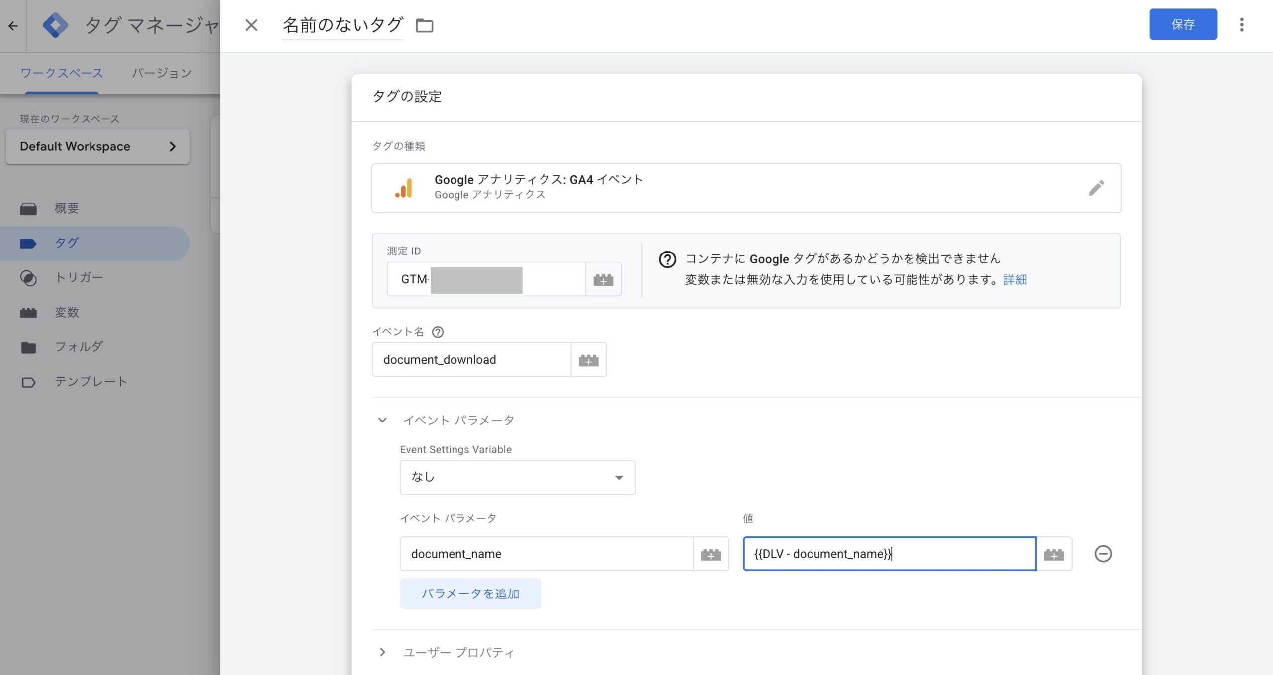document_name と入力(GTMで設定したパラメータ名と完全一致させる)3. 「保存」をクリック