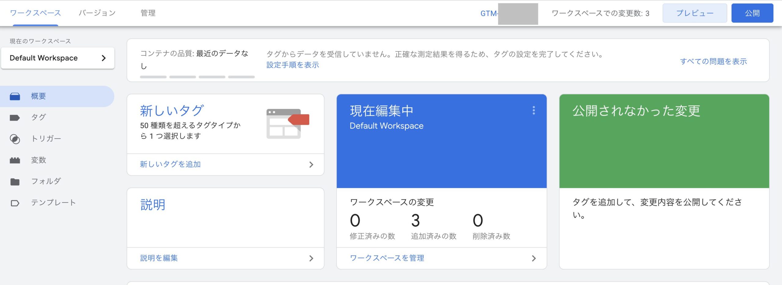 1. GTM画面右上の「プレビュー」をクリック