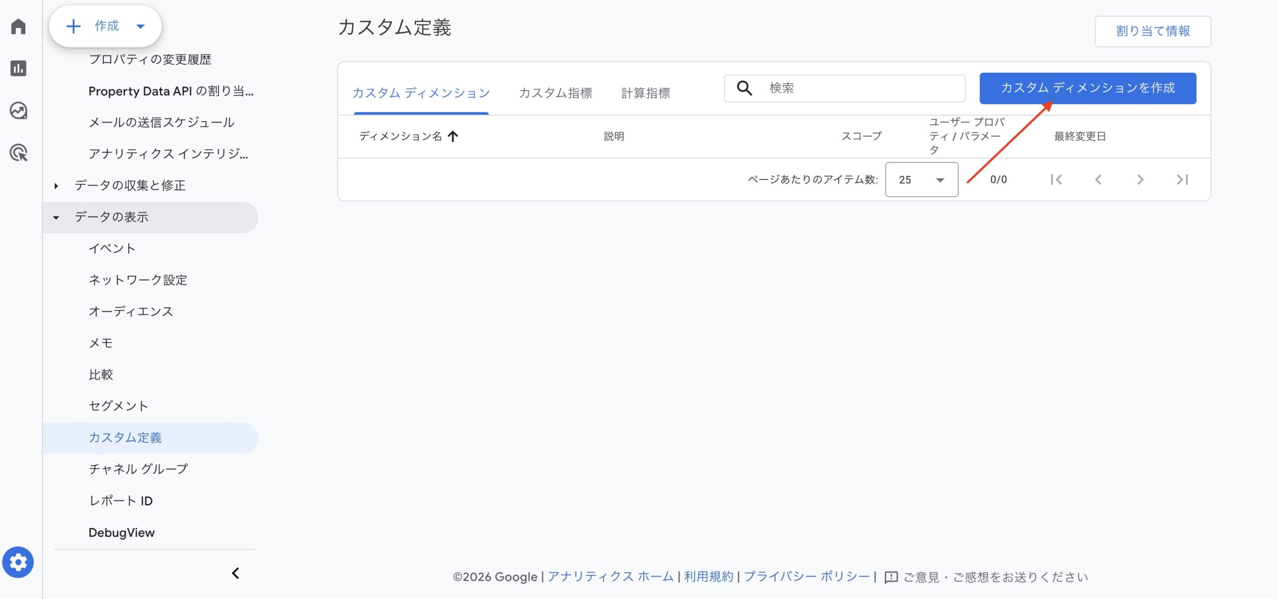 1. 「カスタムディメンションを作成」ボタンをクリック