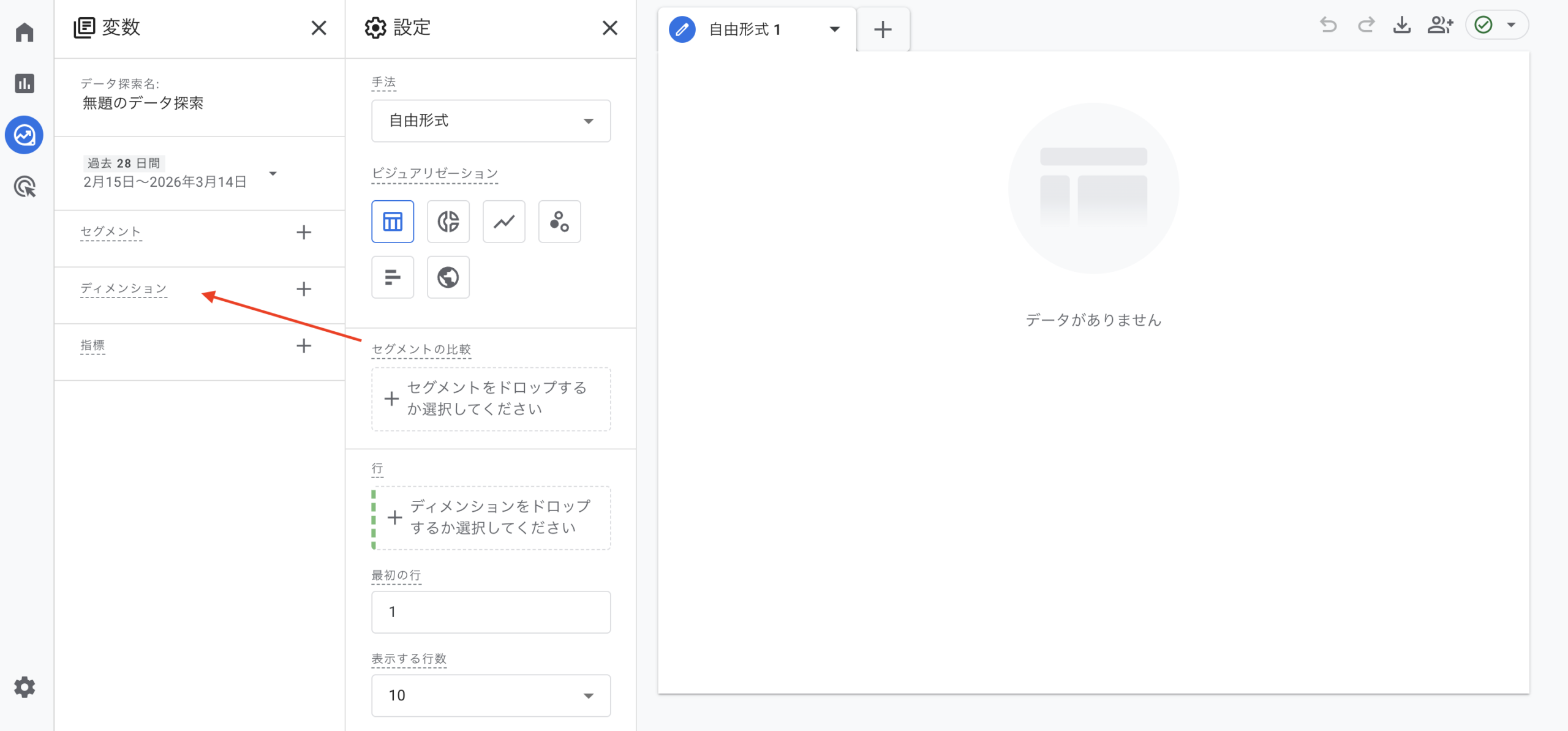 3. 「変数」パネルで「ディメンション」の「+」をクリック