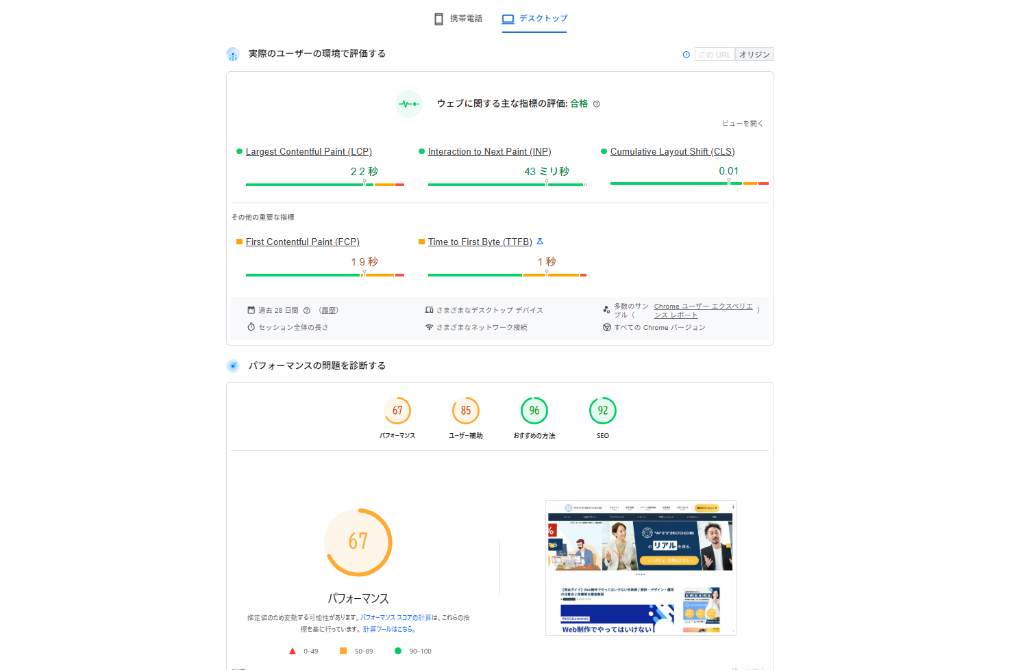 また、モバイルとデスクトップの結果を切り替えて確認できるため、デバイスごとの最適化にも役立ちます。