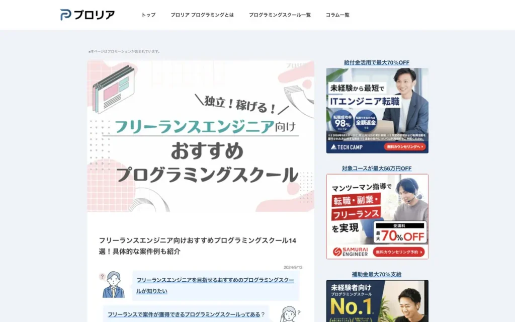 プロリア様の「フリーランスエンジニア向けおすすめプログラミングスクール14選!具体的な案件例も紹介」に掲載されました。