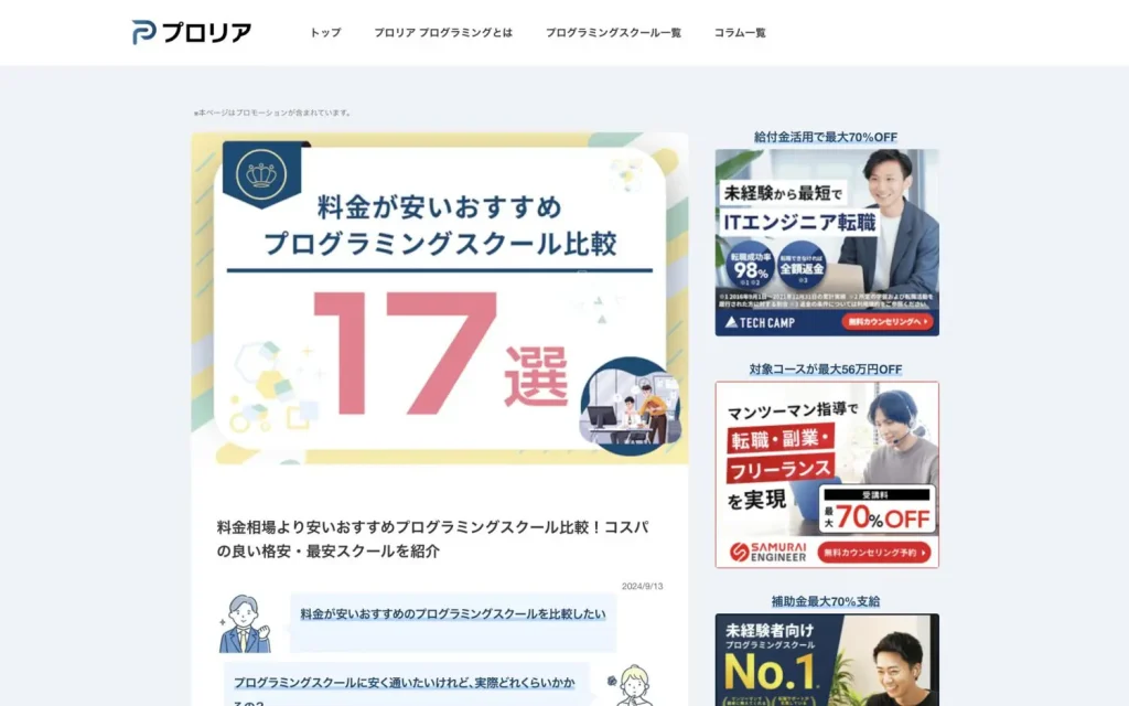 プロリア様の「料金相場より安いおすすめプログラミングスクール比較!コスパの良い格安・最安スクールを紹介」に掲載されました。