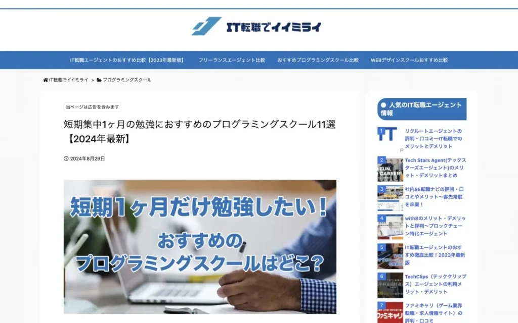 IT転職でイイミライ様の「短期集中1ヶ月の勉強におすすめのプログラミングスクール11選」に掲載されました。